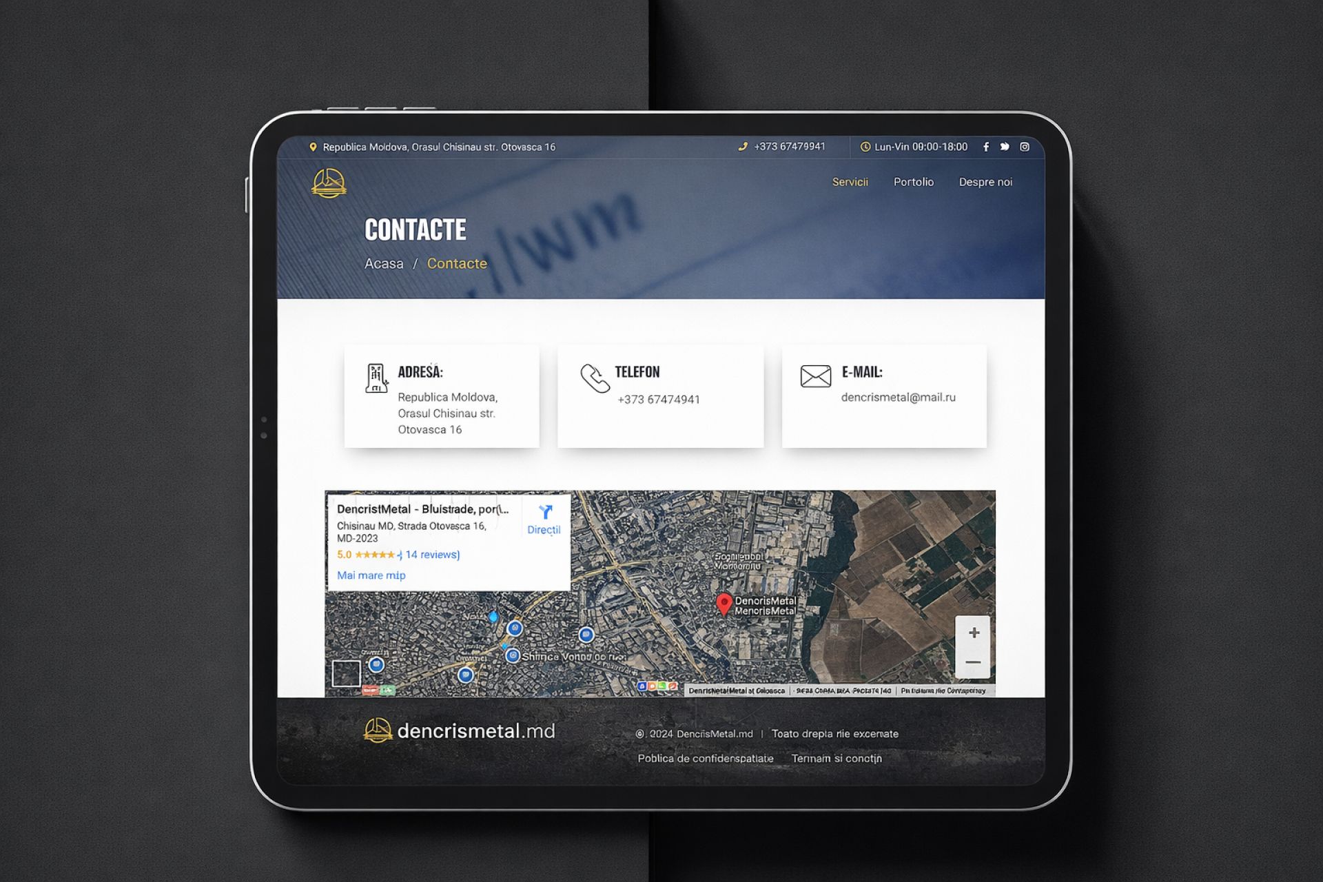 Pentru DencrisMetal.md am creat un website modern dedicat unei companii specializate în lucrări metalice la comandă – porți metalice, balustrade, scări și copertine personalizate. Obiectivul principal a fost construirea unei prezențe online credibile, care să reflecte calitatea lucrărilor și să transforme vizitatorii în clienți.